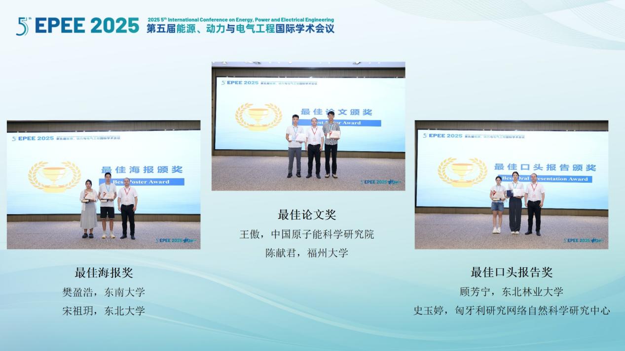 会议闭幕式上颁发了最佳论文奖、最佳口头报告奖和最佳海报奖,严文生教授为获奖代表颁奖。这些奖项不仅是对优秀学术工作的认可,也体现了会议“创新驱动发展”的核心理念,有效激励学者持续探索科技前沿。EPEE 2025为领域内学者提供了高水平的交流平台,促进了产学研深度融合与国际合作,对推动能源、动力与电气工程科技创新与产业发展具有积极意义。
